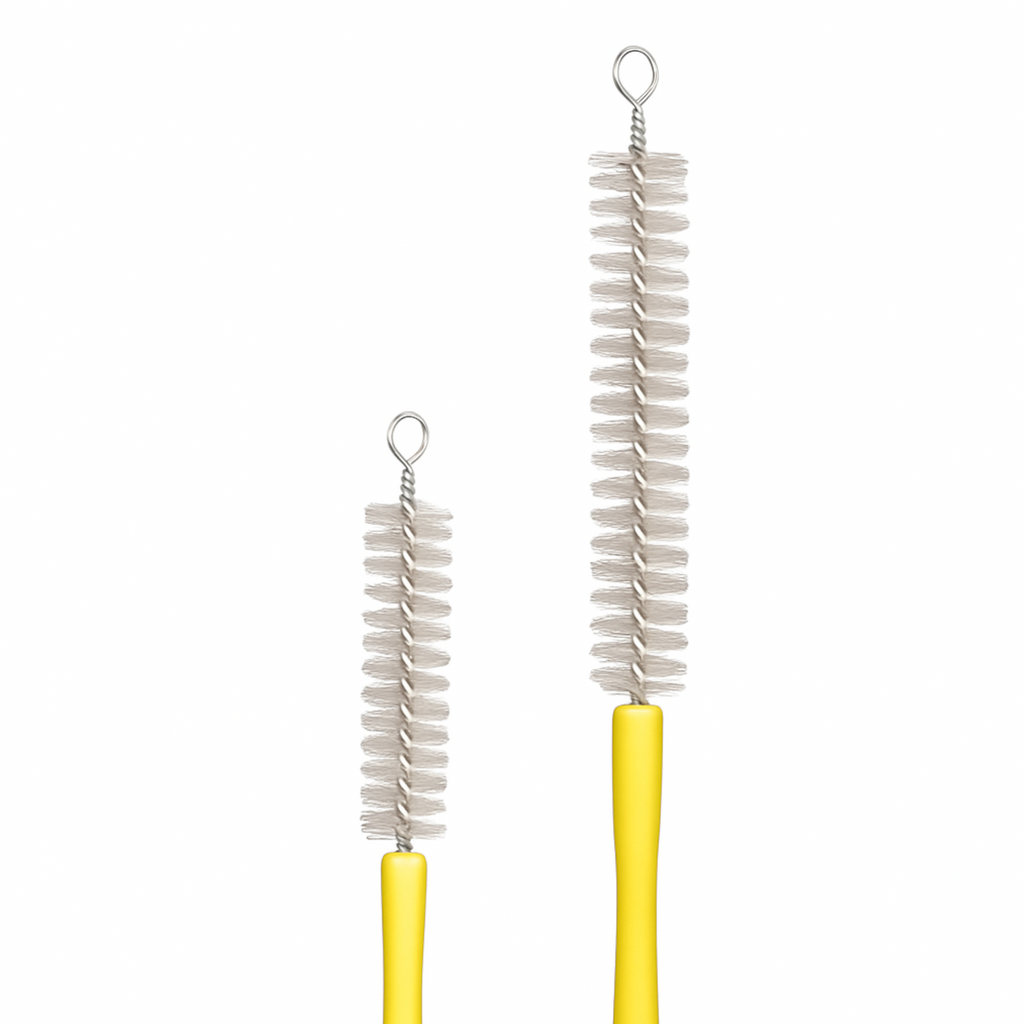 Die kompakte Doppel-Reinigungsbürste mit 3 mm Bürstenkopf eignet sich optimal für die manuelle Reinigung von Biopsiekanälen mit einem Durchmesser ab 2,0 mm. Die beiden Bürstenköpfe sind auf einem flexiblen, gelb ummantelten Draht befestigt und ermöglichen eine gründliche Innenreinigung über die gesamte Länge.