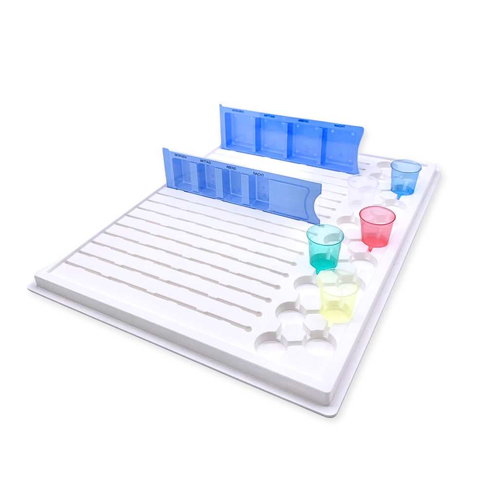 Dieses speziell entwickelte Tablett ermöglicht den sicheren und übersichtlichen Transport von Medikamentendispensern und Medizinbechern. Es bietet Platz für bis zu 19 Medikamentendispenser sowie 19 Medizinbecher, wodurch eine strukturierte und hygienische Medikamentenverteilung gewährleistet wird.